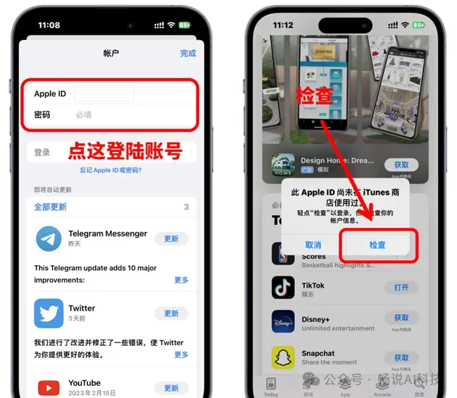 填写新的Apple ID和密码进行登录:如果提升Apple ID未使用过,点击“检查”