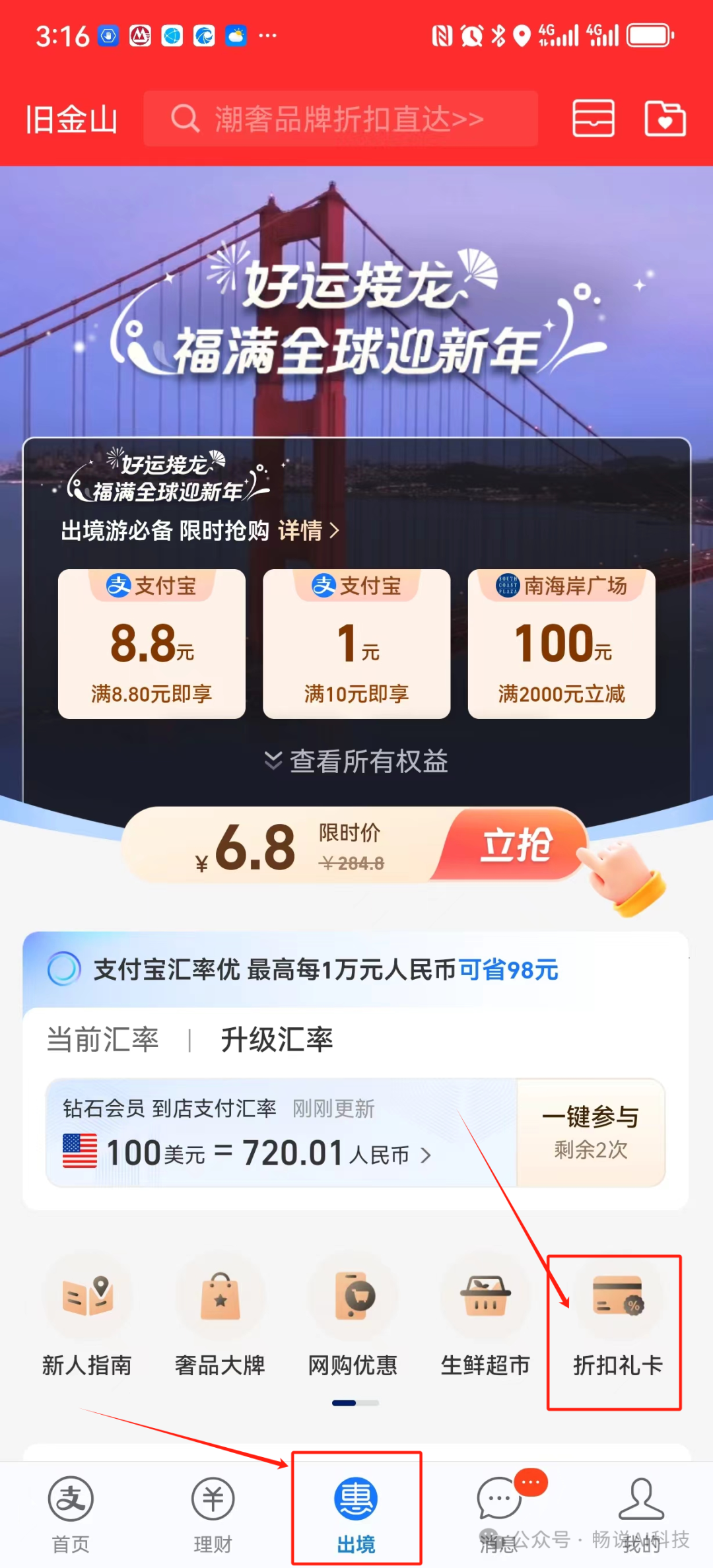 点击底部的“出境”,选择页面中间右侧的“折扣礼卡”