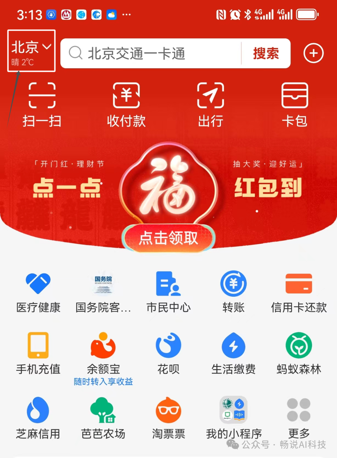 打开支付宝,点击左上角的地区,选择美国的一个地区,如旧金山