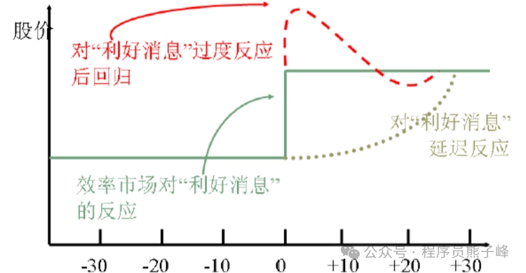 在有效市场中,市场对利好消息的反应是迅速且准确的。当有利好消息发布时,股价会立即上升到一个新的平衡水平。绿色的线显示了股价在消息发布后立刻跳升,并保持在新的高水平上。