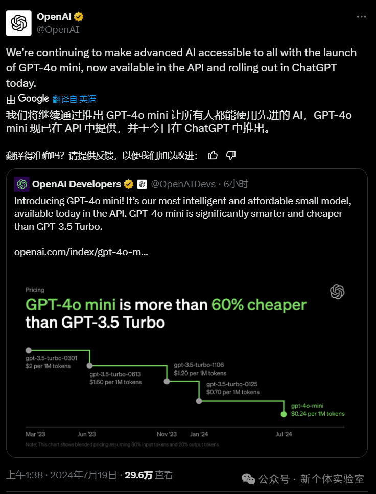 早上起来,就看到 OpenAI 官方发布的消息,已经正式发布了 GPT-4o mini 模型。