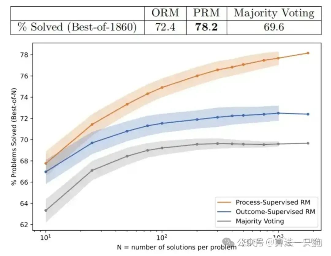 OpenAI使用MATH测试集里面的问题来评估“过程监督”和“结果监督”奖励模型,并为每个问题生成了许多解答方案,然后选择每个奖励模型排名最高的解答方案。