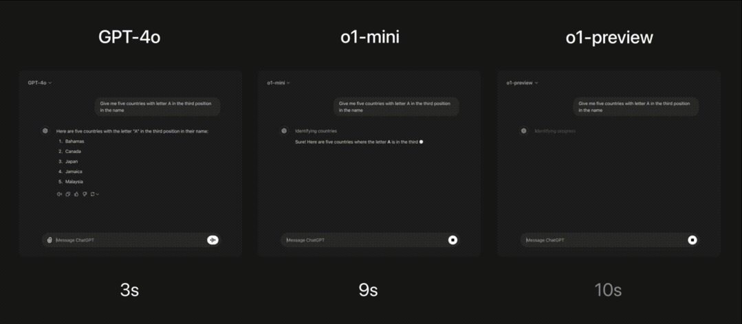 对于同样一个问题,虽然 GPT-4o 没有正确回答,但 o1-mini 和 o1-preview 都正确回答,并且 o1-mini 达到答案的速度大约是 3-5 倍。